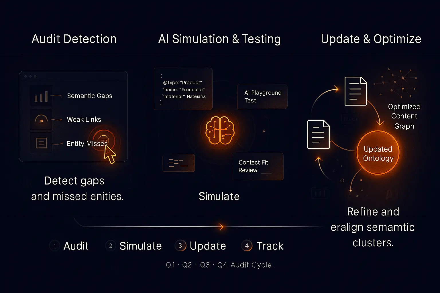 - Run quarterly audits to detect semantic gaps, weak links, and entity misses.