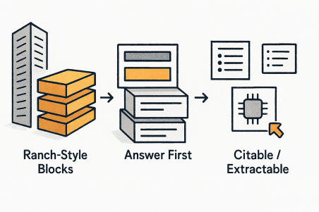 Your content needs to be organized into self-contained, easily readable chunks that an AI could take and use exactly as a quote. We refer to this architecture as Ranch-Style because it is short, wide, and simple for the AI's retrieval system to navigate.