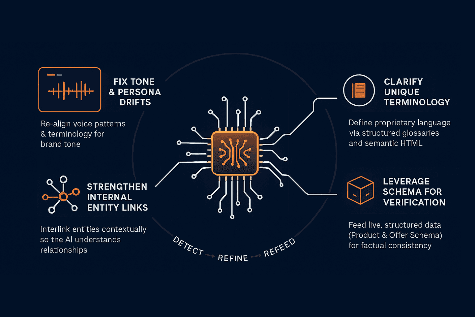 Fix Tone and Persona Drifts | The AI employs language that seems excessively formal, informal, or unsuitable for your brand (e.g., jargon misuse). | Combine your high-authority content and update your content style guide. Check that your ideal brand voice is consistently copied by your most authoritative pages. |