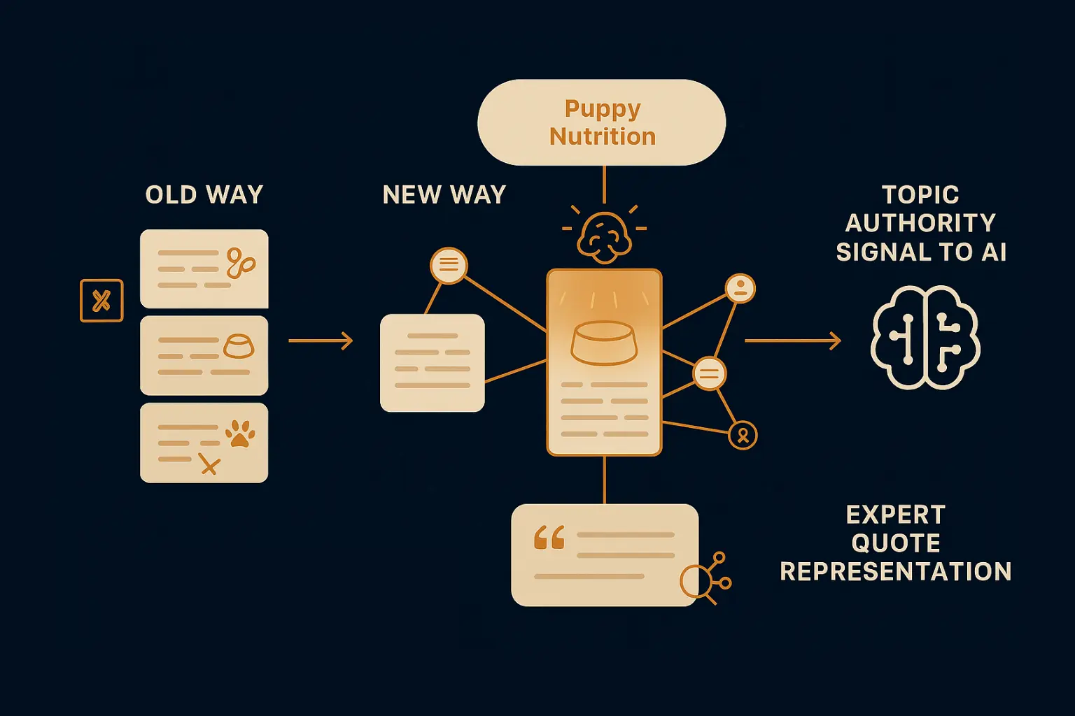 Old Way (Keywords): You would write distinct posts for "what to feed my new puppy," "best dog food for puppies," and "puppy food reviews."